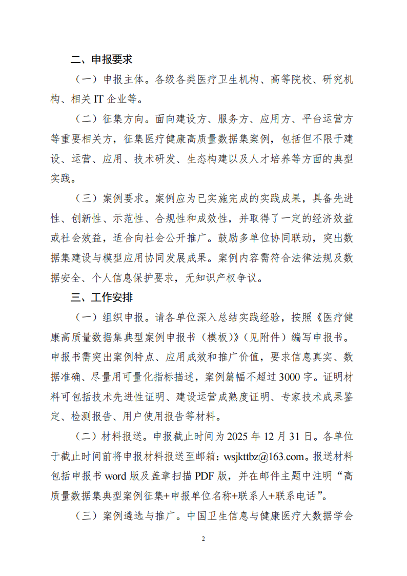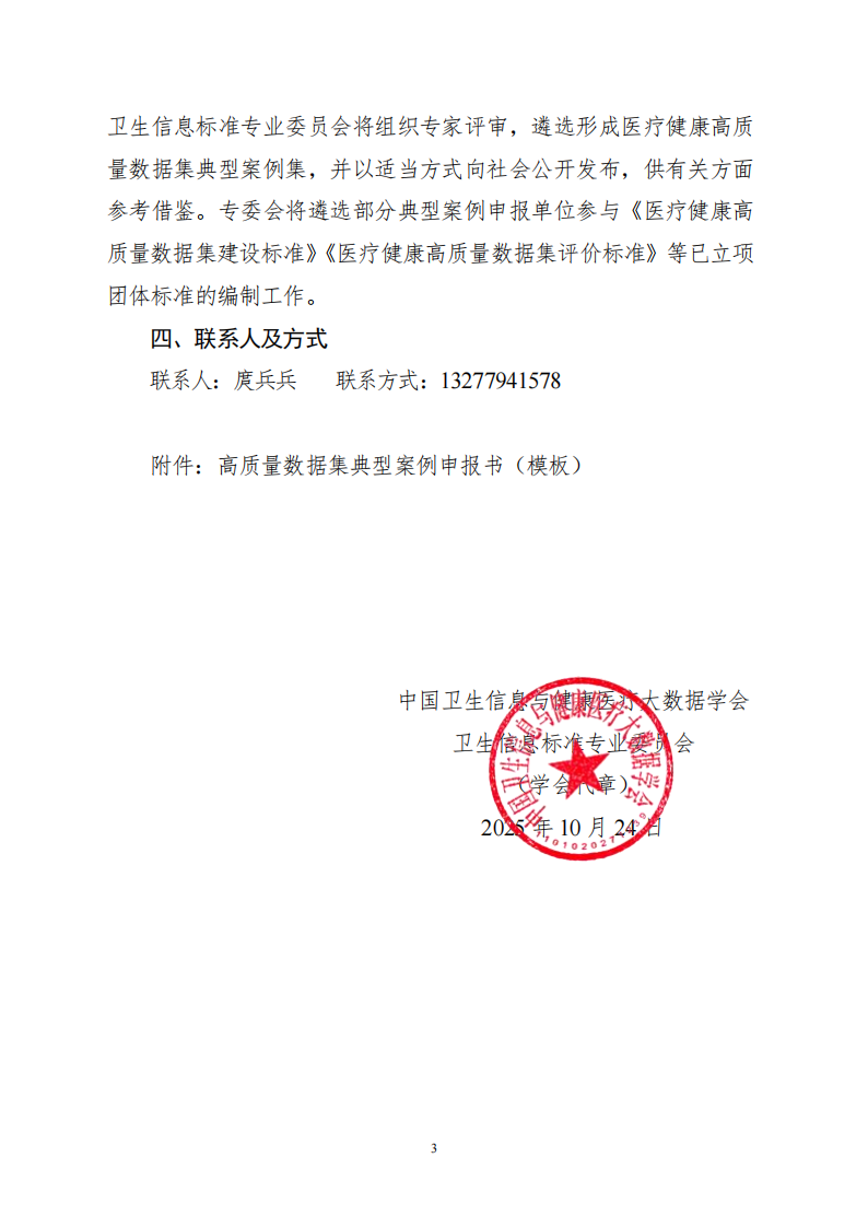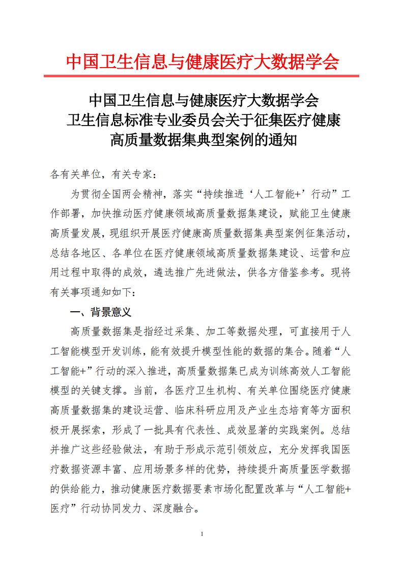 中国卫生信息与健康医疗大数据学会卫生信息标准专业委员会关于征集医疗健康高质量数据集典型案例的通知